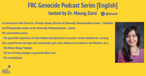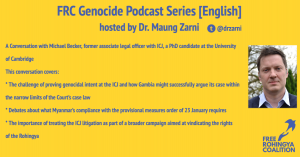 FRC Genocide Podcast Series မြန်မာပိုင်းအစီအစဉ်မှာ ရန်ကုန်-အခြေစိုက် နိုင်ငံတကာသတင်းထောက် Ko Cape Diamond က ပါဝင်ဆွေးနွေးထားပါတယ်။ ရိုနေဆန်းလွင် က စီစဉ်တင်ဆက်ထားပြီး၊ ဒီဆွေးနွေးခန်းမှာ – မြန်မာနိုင်ငံမှာ ရိုဟင်ဂျာနဲ့ ပတ်သက်လာရင် အသုံးအနှုံးတွေ၊ လူ့အခွင့်အရေးစံနှုန်းတွေ ဘာကြောင့်ကွဲပြားနေတာလဲဒီနှစ်ပိုင်းမှာ ပြောင်းလဲလာတဲ့ ရခိုင်ပြည်သူတွေရဲ့ အမြင်ရခိုင်ပြည်နယ်တွင်း သတင်းယူခဲ့စဉ် ရရှိခဲ့တဲ့ အတွေ့အကြုံ၊ ICJ ကြားဖြတ်အစီအမံ နောက်ပိုင်း ပြောင်းလဲမှု ရှိ/မရှိ — စတာတွေ စုံစုံလင်လင် ဆွေးနွေးထားတာကို နားဆင်နိုင်ပါပြီ။
